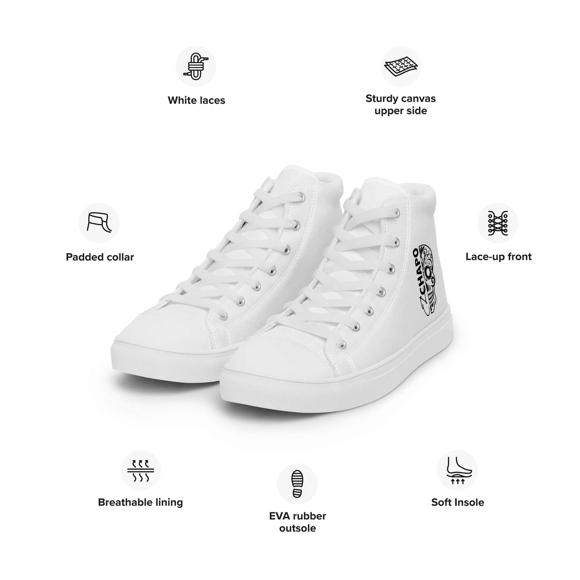 Step up your style with the El Chapo WHT OUT Women’s high top canvas shoes, that blends bold design, comfort, and versatility. Perfect for trendsetters who value performance and customization.